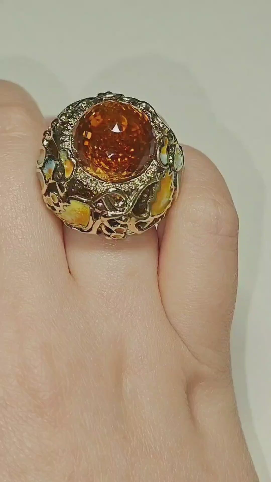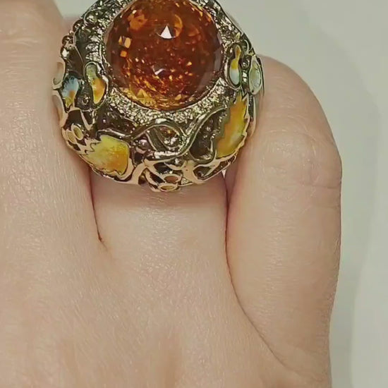 The "Autumn ring" from the "Stone Garden Collection", made from 18K yellow gold, the center stone is a 33ct. briolette citrine madeira gemstone pear, hot enamel paintings. Set with 0.5ct. yellow sapphires (on the inside of the ring under the citrine as well).